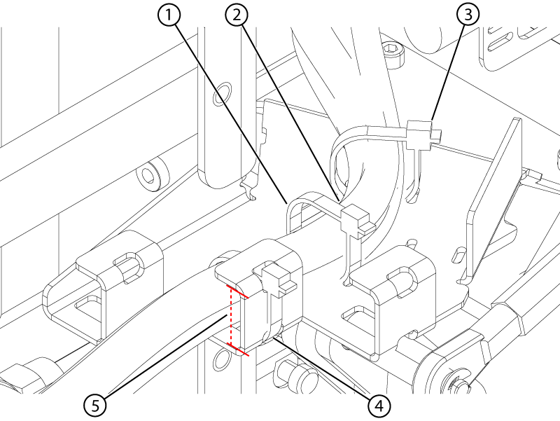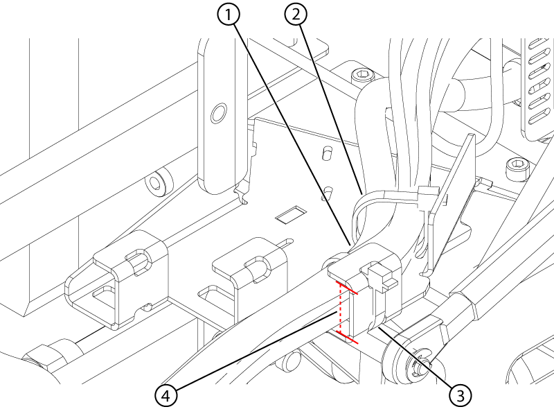 When the distance is within tolerance, install four cable ties securing the cables to the end of the cable track plate. Split the cable into two approximately equal bundles and install two of the cable ties on each half bundle.