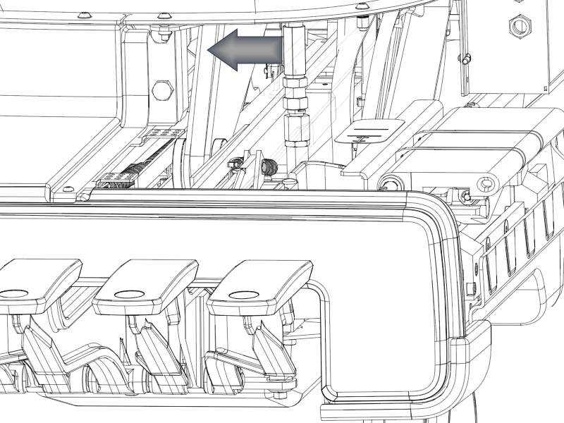 - Raise the table lock safety bar to its upright position and lower the patient table.Note: Make sure the high-pressure hoses reattached in Step 2 are not being pinched by table components when the table is lowered. If the hoses are being pinched, adjust the angle of their swivel fittings inward.