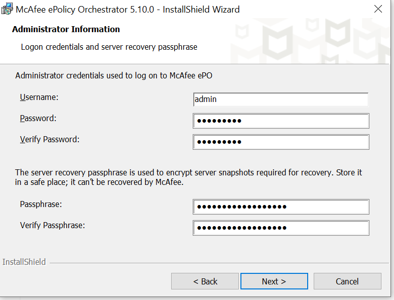 2. Server recovery passphrase. This passphrase should be remembered, as it is needed to decrypt the Disaster Recovery Snapshot records and McAfee cannot recover it. It includes 14-200 characters, no backslashes, no spaces, no double quotation marks, and no characters below ASCII 32 or above ASCII 6535. Click Next.