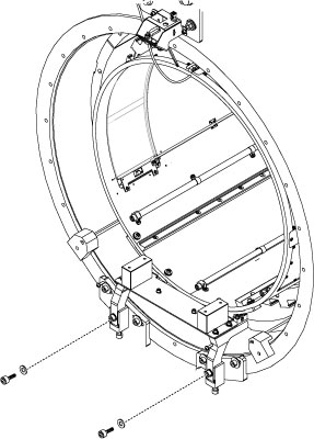 - On the front end of the magnet, remove four M6 bolts and washers from the bases of RF coil centering assembly.