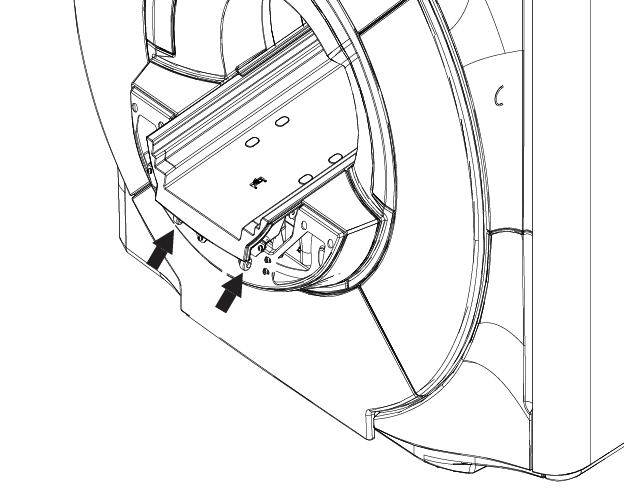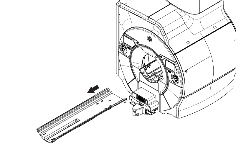 7. With two people: on the service end, one person lifts the end of the bridge up until the rollers are clear of the edge of the bore. From the patient end, the second person pulls the 1-piece bridge forward until the rollers can rest on the rails.
