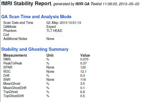 Results are given in a PDF file that summarizes QA scan time and analysis mode; stability and ghosting summary with reported variables; scan protocol; ROIs used to calculate reported variables and plots; stability and ghosting plots; temporal average; SFNR map; comparison of odd and even images; and noise versus time.