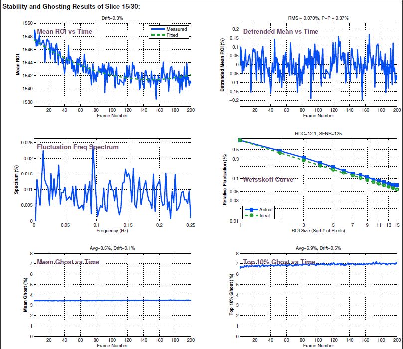 Results include mean ROI versus time, detrended mean versus time, fluctuation frequency spectrum, Weisskoff curve, mean ghost versus time, and top 10% ghost versus time.