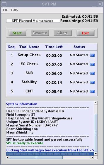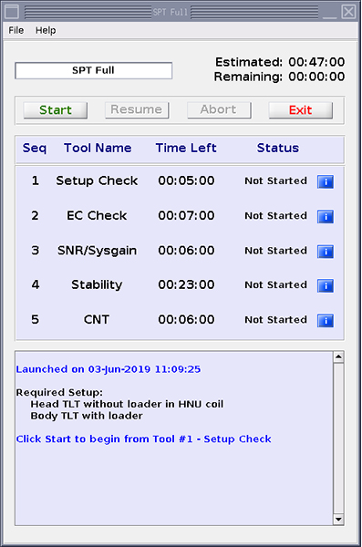 When SPT is complete, the message SPT execution completed shows in the status window.Note: The setup check will confirm setup for both head and center locations. - Resolve any errors or failures and click Start to run SPT again.Note: Do not click Resume if SPT is being called from ICW. Always click Start to complete the test from ICW.
