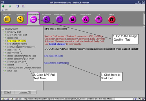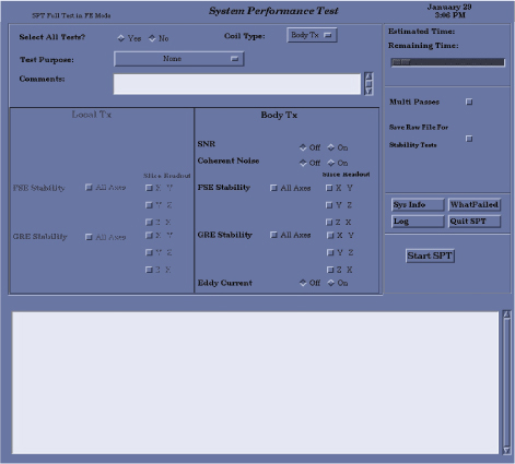 System Performance Test (SPT) runs phantom position checks before starting any user-selected SPT except the Coherent Noise Test. It takes approximately two minutes for the head phantom position check and two minutes for the body phantom position check. The test will not start unless the phantom position checks are successful.