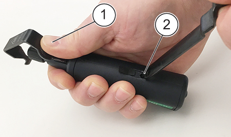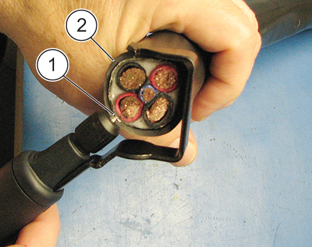 1 Push up on small hook 2 Hook release, stem of large hook Note: Give some slack to the cables before cutting to length. Slack is necessary for re-termination, if required. - Put the stripper at the end with the blade next to the outer jacket. Rotate the collar to adjust the blade depth to match the thickness of the outer insulation, making sure the blade will not cut into the braid layer.