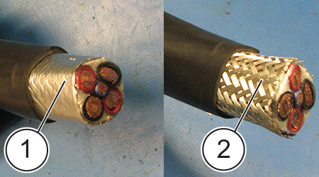 1 Foil shield 2 Braid shield - Carefully cut the braid shield using a diagonal head semi-flush or shear wire cutter. Do not use a knife as this may cut into the wires.
